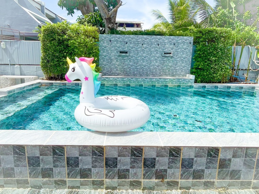 สระว่ายน้ำ ขนาดสระ 4เมตร x 7 เมตร ความสึก 1.2 – 1.5 เมตร ไต่ระดับ