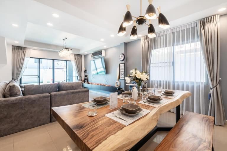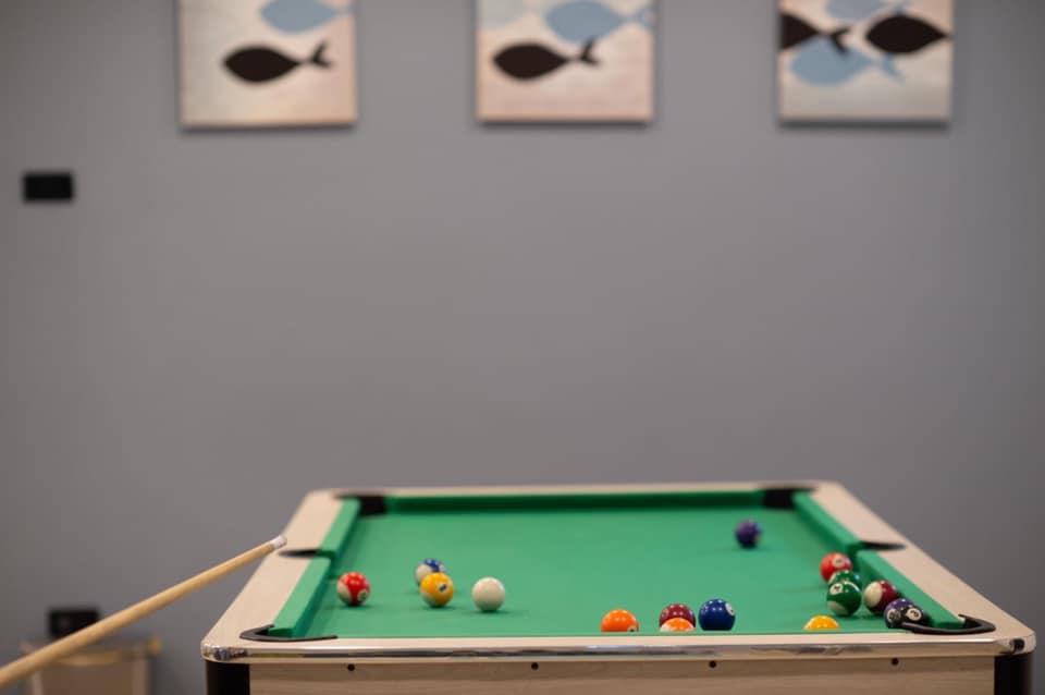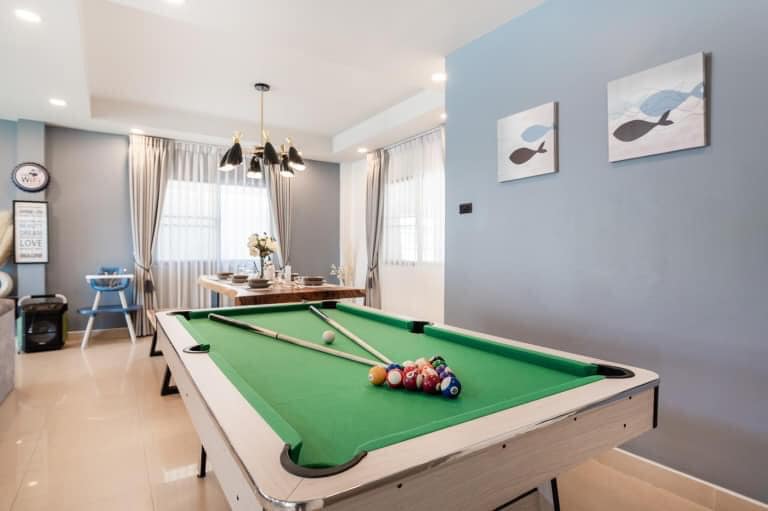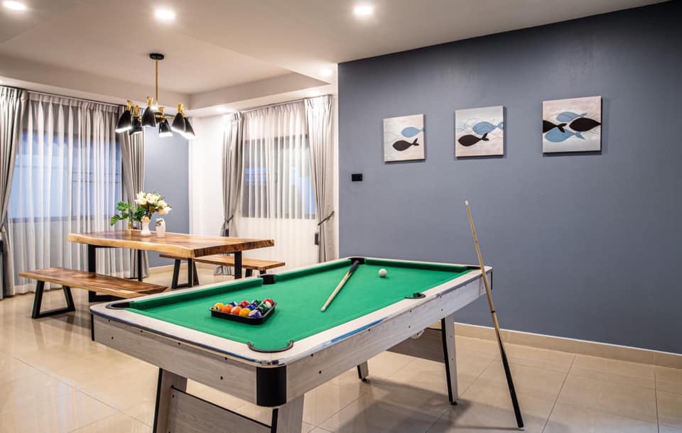 ✅โถงห้องนั่งเล่นขนาดใหญ่ มีมุมโต๊ะอาหารพร้อมที่นั่งเด็กเล็ก,โต๊ะพูลเล็ก