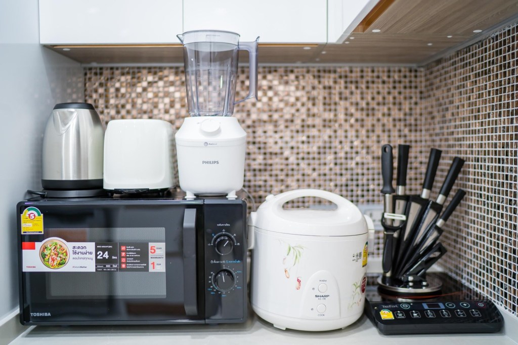 อุปกรณ์พื้นฐานครบ จาน ชาม ช้อน ส้อม มีด ครก เตาอุปกรณ์ปิ้งย่าง เตาแก๊ส หมอหุงข้าว ไมโครเวฟ ที่ปิ้งขนมปัง หม้อ กระทะ ถังใส่น้ำแข็ง