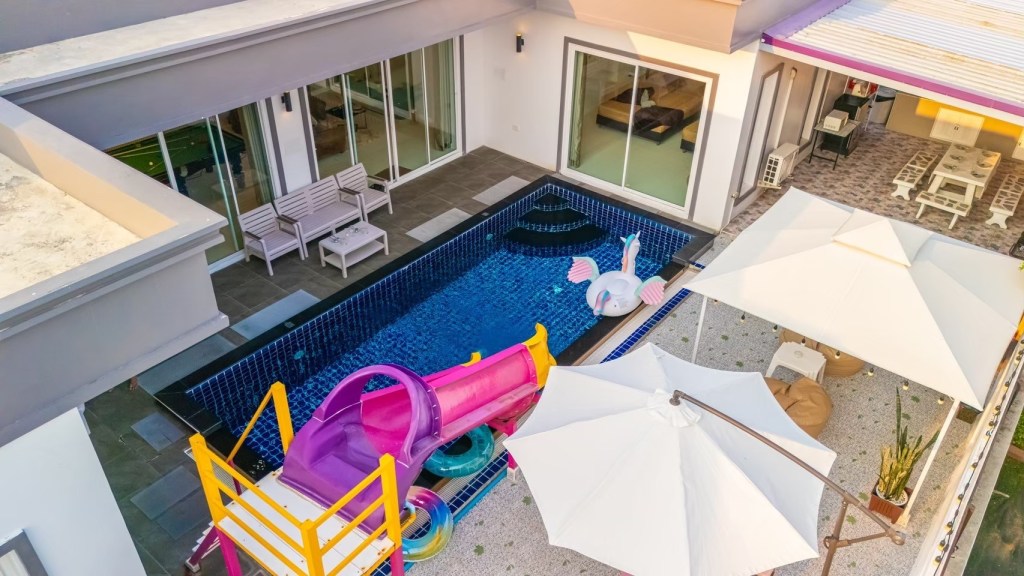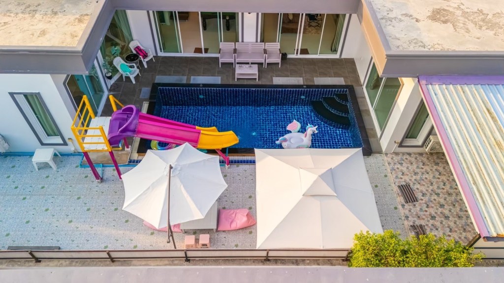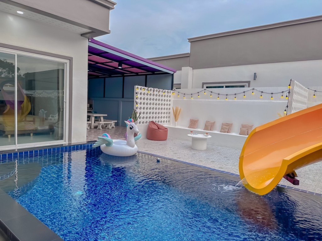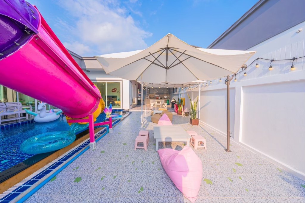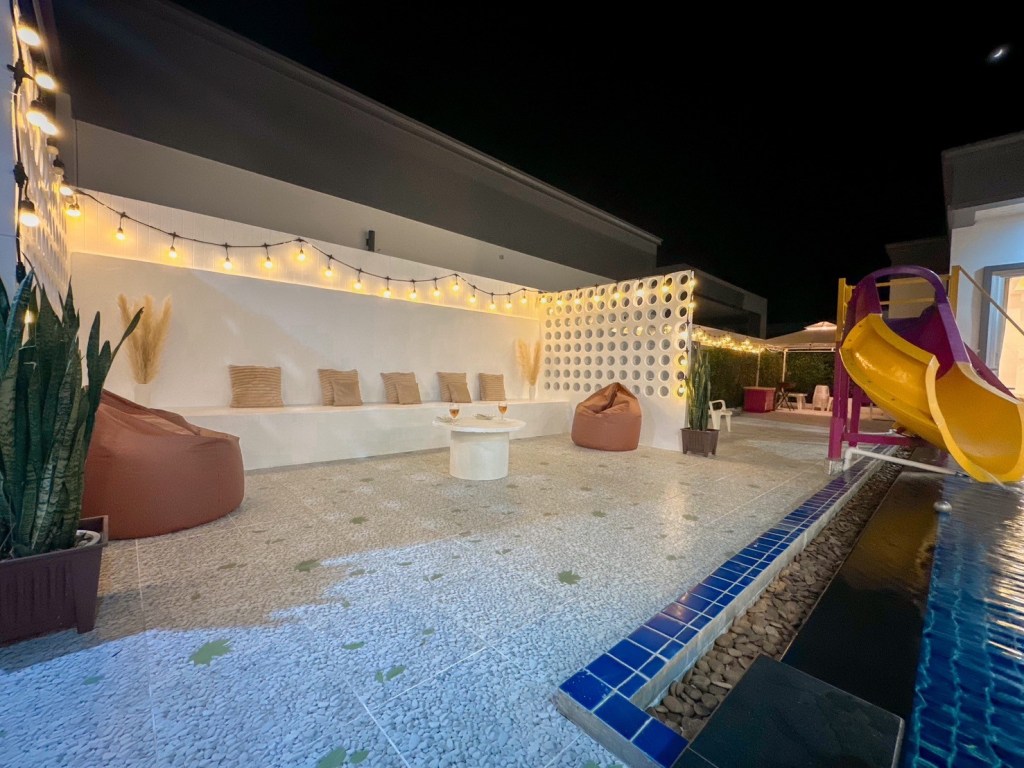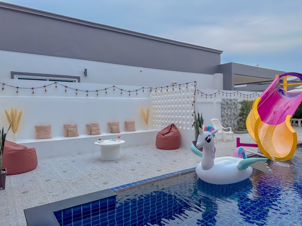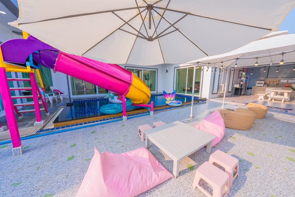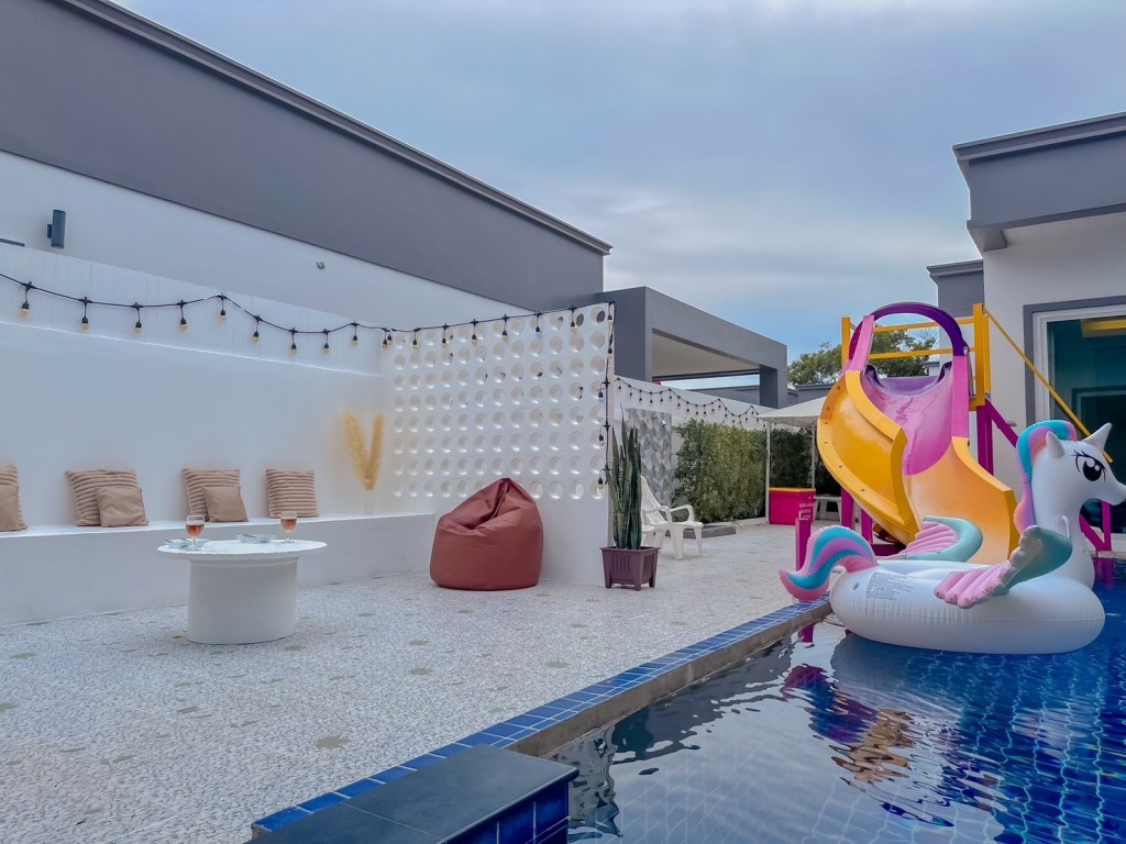 🎀ตกแต่งในสไตล์สีสันสดใส ฟังชั่นครบจัดเต็มเหมือนเดิมค่ะ มาพร้อมบริเวณกว้างๆสนามข้างสระ และมุมถ่ายรูปชิคๆ💖มีครัวข้างบ้านใกล้ๆกับจุดปิ้งย่าง สะดวกสบายอุปกรณ์ครบครันในการทำอาหารเลยคะ😊 #รับประกันความสะอาดและตรงปก
