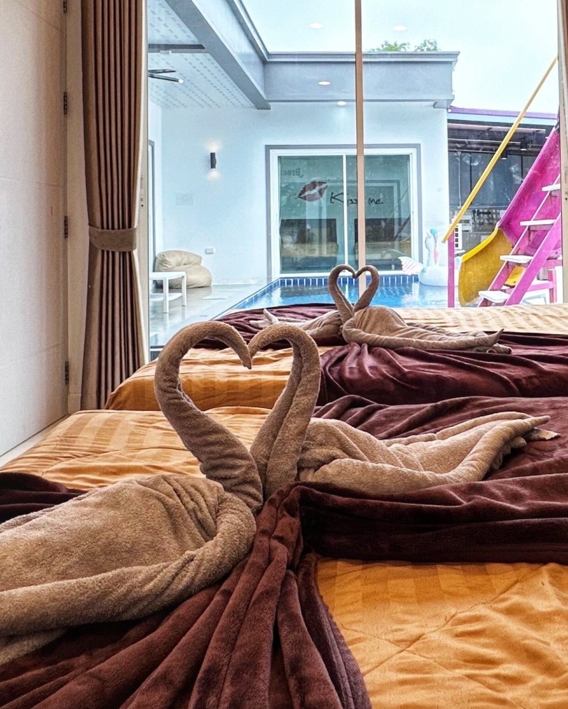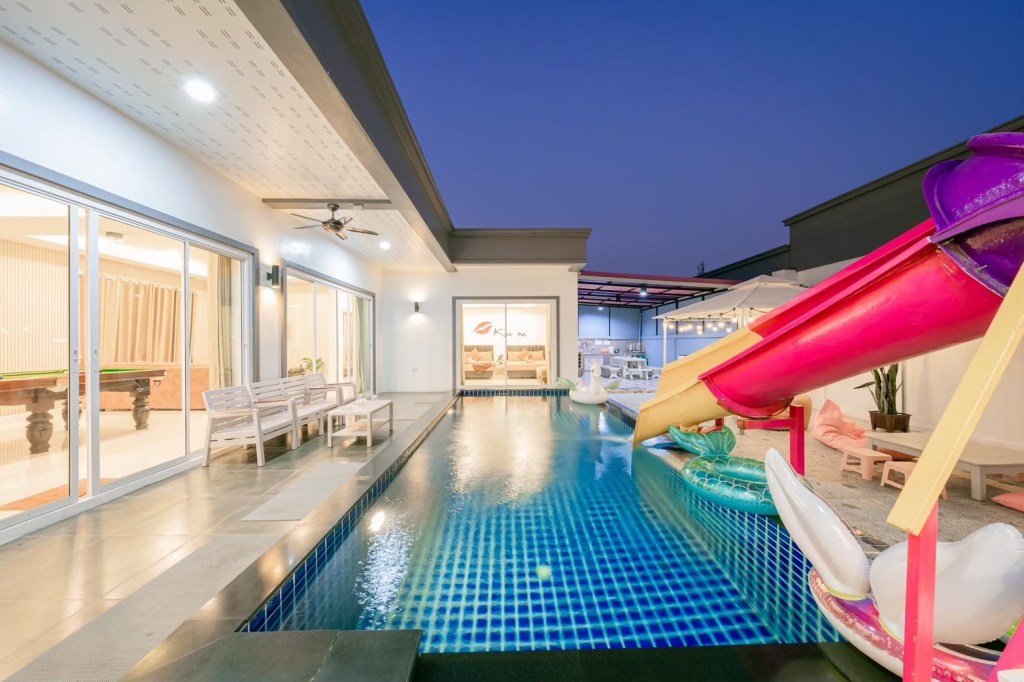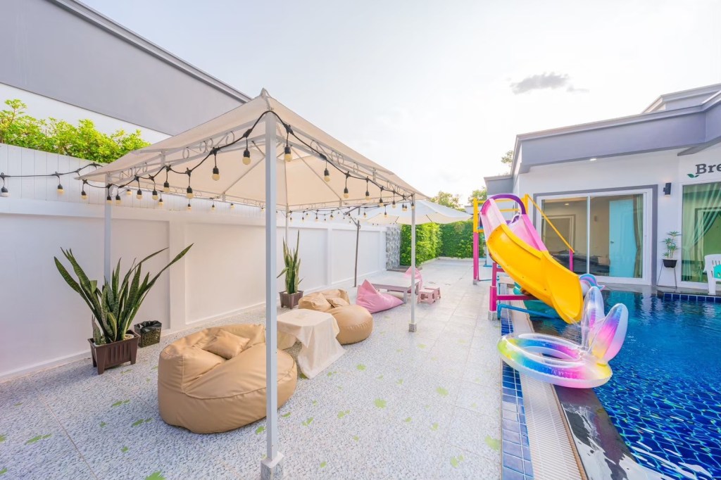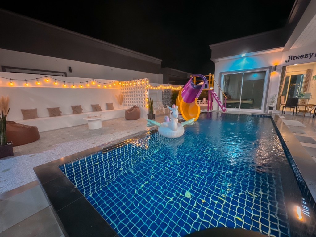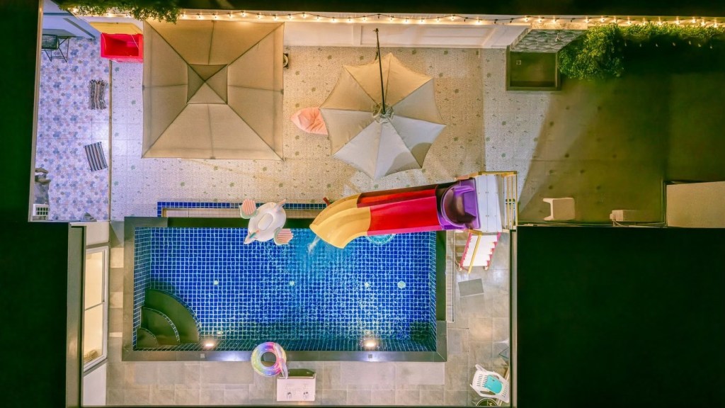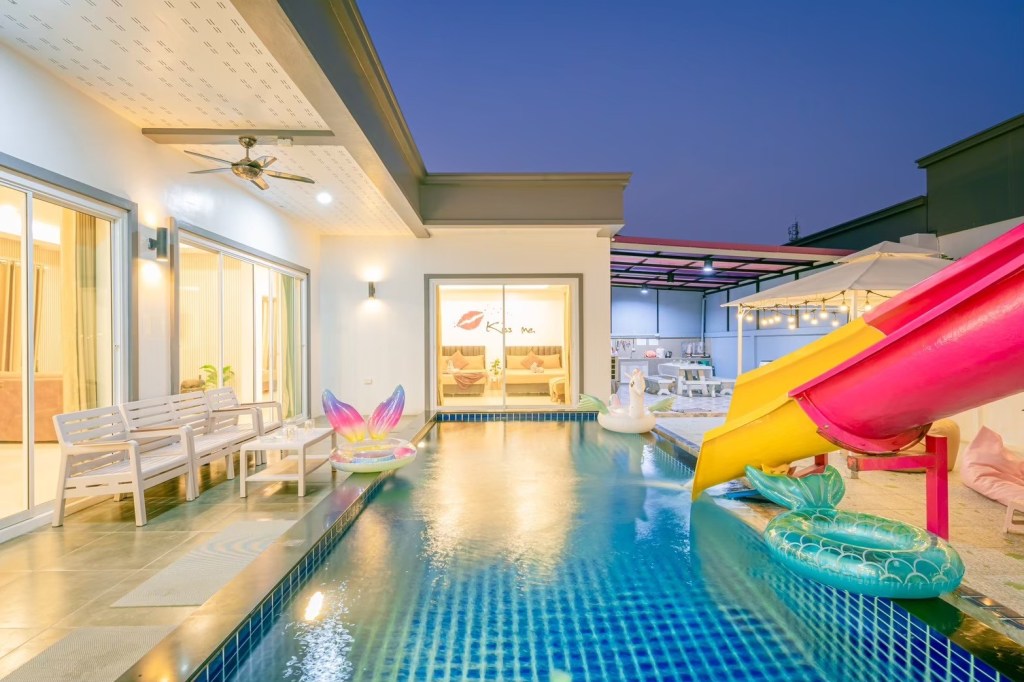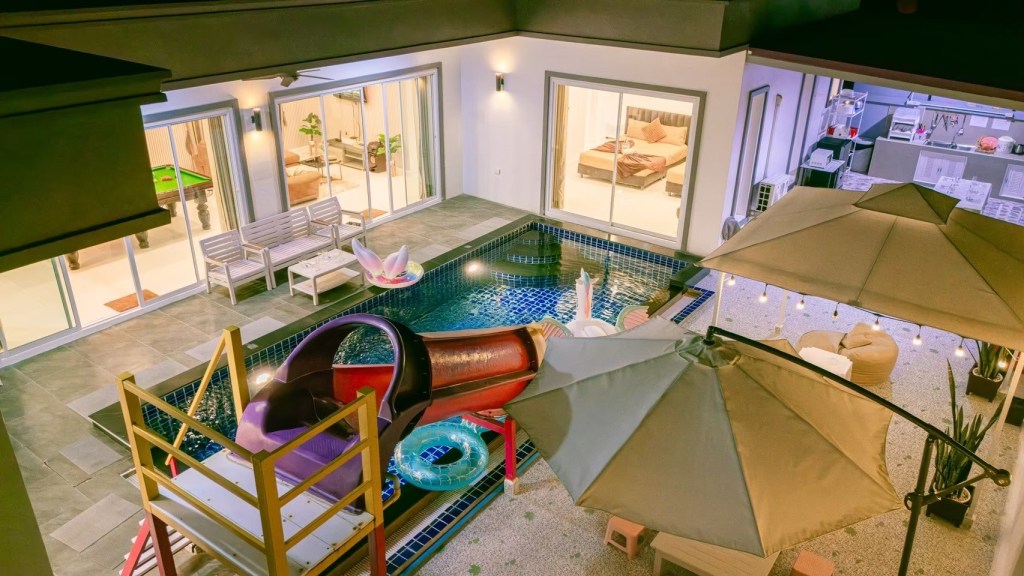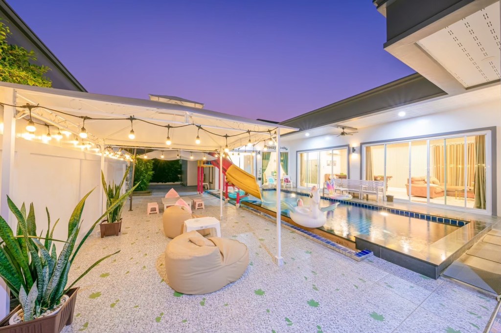 🎀ตกแต่งในสไตล์สีสันสดใส ฟังชั่นครบจัดเต็มเหมือนเดิมค่ะ มาพร้อมบริเวณกว้างๆสนามข้างสระ และมุมถ่ายรูปชิคๆ💖มีครัวข้างบ้านใกล้ๆกับจุดปิ้งย่าง สะดวกสบายอุปกรณ์ครบครันในการทำอาหารเลยคะ😊 #รับประกันความสะอาดและตรงปก